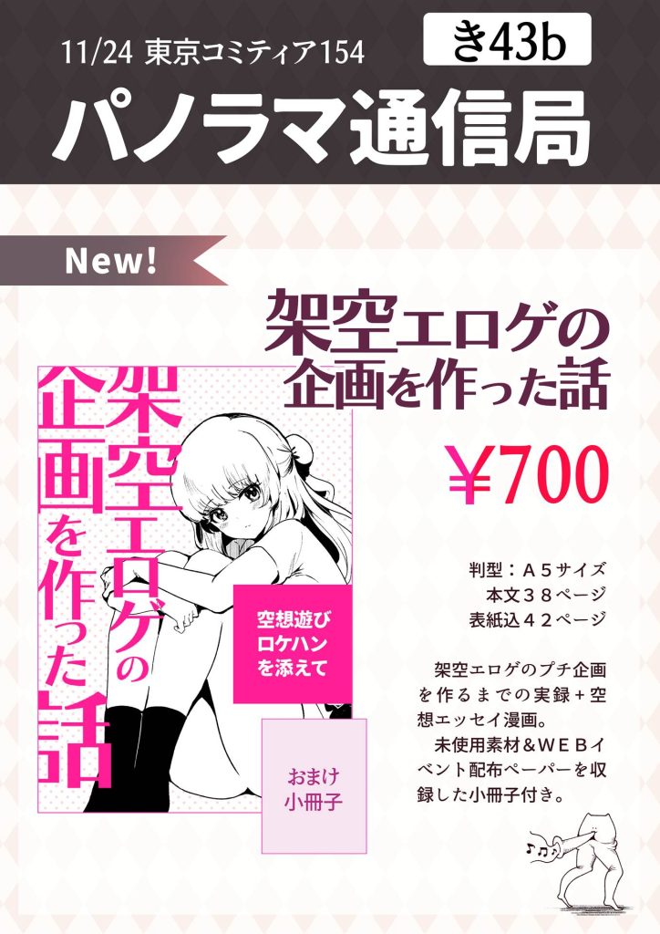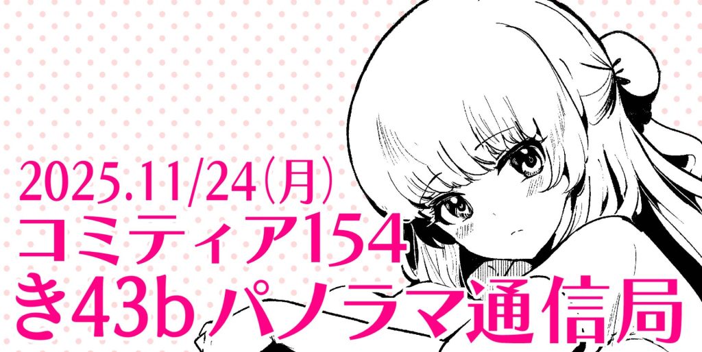 コミティア154 “き43b”パノラマ通信局 2025.11.20 お品書き コミティア154新刊「架空エロゲの企画を作った話」会場頒布となります。今回は所用により紙の部数は控えめにしておりますので、通販は会場で余ったやつを自家通販という形でお送りする予定です。 電子版はDLsite及びDMMメインで予定しております。 試し読み